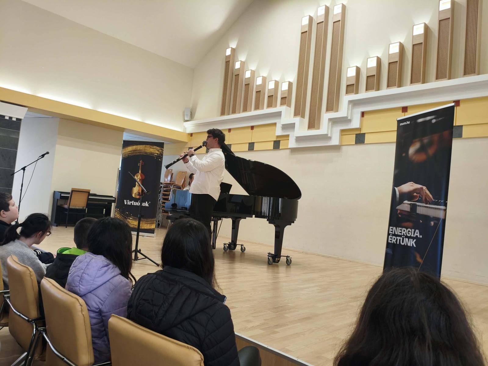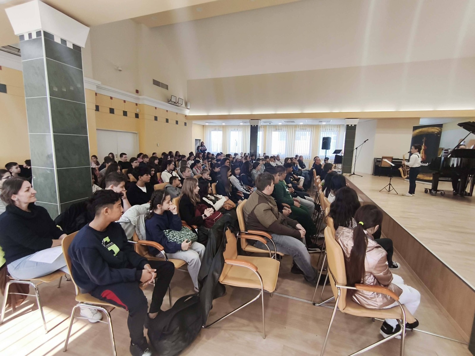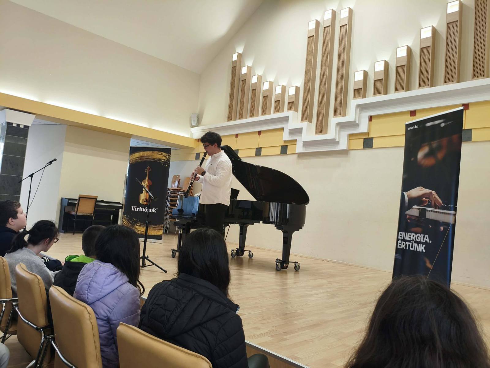 Iskolánk 6. évfolyamos tanulói a Lázár Ervin Program keretében a Kodály Zoltán Zeneművészeti Szakgimnázium és Zeneiskola Kis Virtuózok Alapítványa tagjainak előadásában különböző hangszerekkel és komolyzenei darabokkal ismerkedtek a tavaszi szünet előtti utolsó napon Debrecenben a szakgimnázium Simonffy termében. A Zene jövője és Földünk jövője című hangversenyre Demeter Ágnes és Székely Bence osztályfőnökök kísérték el a gyerekeket. KGYZE
