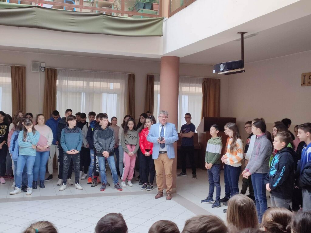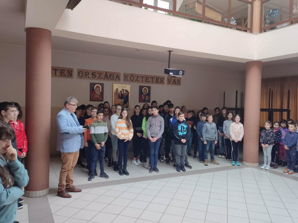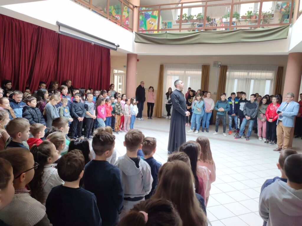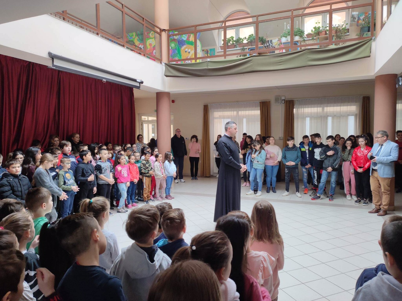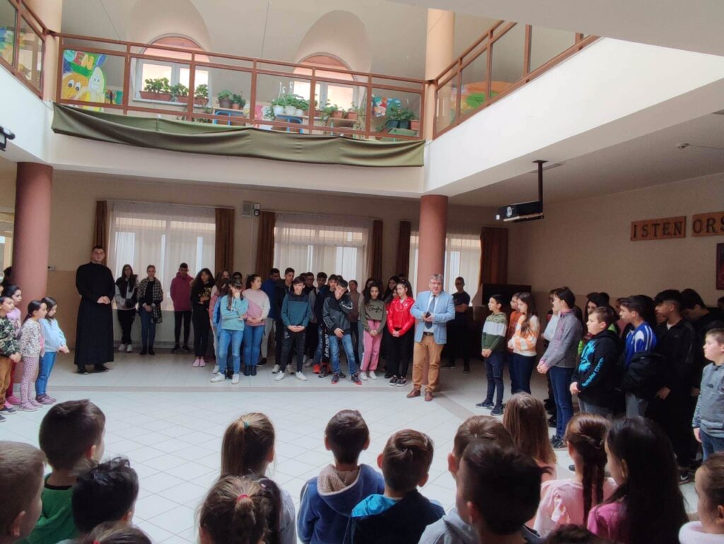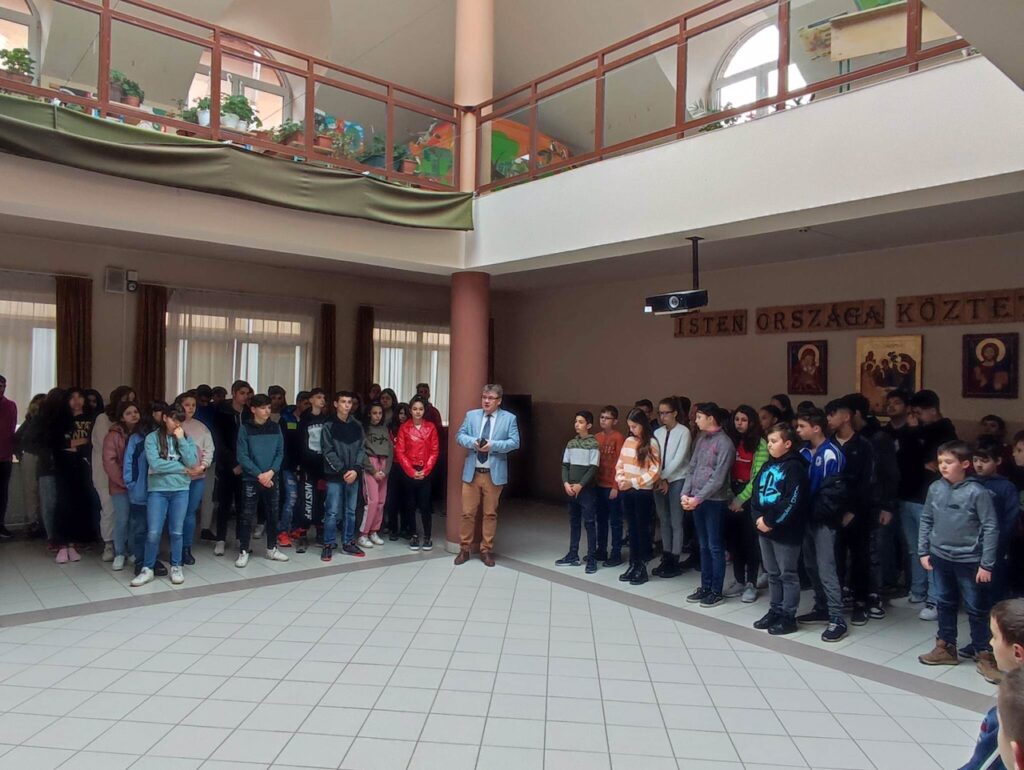 A negyedik nagyböjti hétindító találkozást a mai napon is a Tatai Zoltán atyával közösen elmondott Szent Efrém imával kezdtük az aulában. Ez alkalommal Garda László intézményvezető szólt a diákokhoz. Felhívta a figyelmet arra, hogy az előző nap, a kereszthódoló vasárnap azt jelenti, hogy a böjt felénél tartunk. Elmagyarázta, majd egy szemléletes történettel érthetővé tette a diákoknak, a kisebbeknek is, hogy a legnagyobb kereszt mindenkinek a maga keresztje. Nem érdemes elcserélni senkivel, és nem érdemes a másik keresztjére vágyni, mert lehet, hogy a másik ember könnyebbnek tűnő keresztjének viselése sokkal nagyobb terhet rakna a vállunkra. KGYZE (Fotó: Marozsán Tiborné)