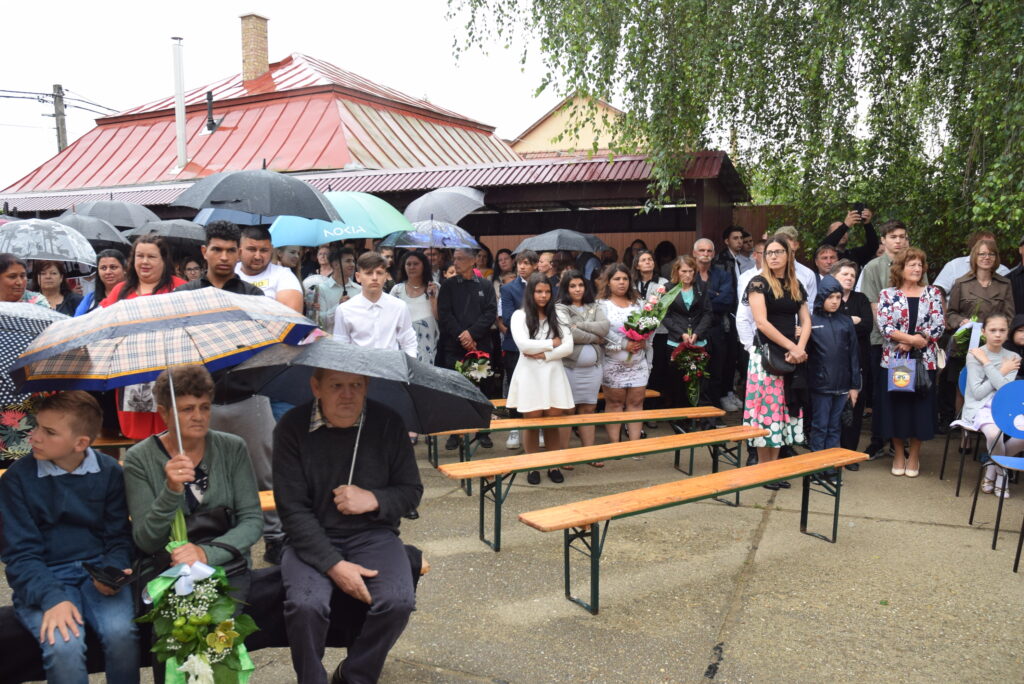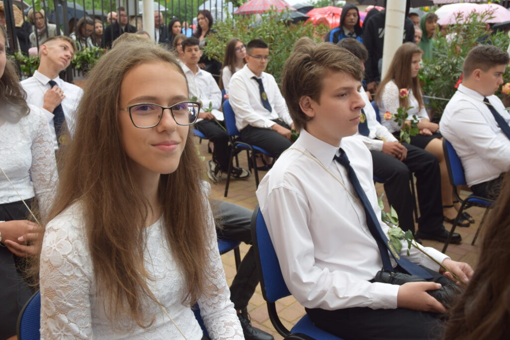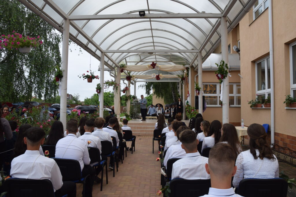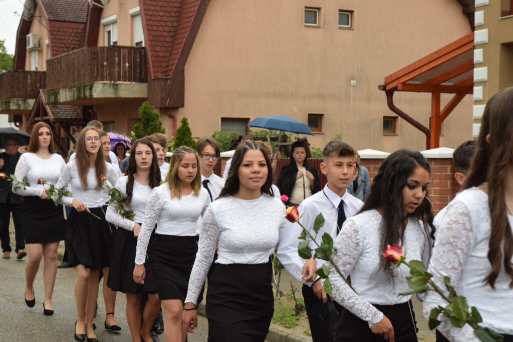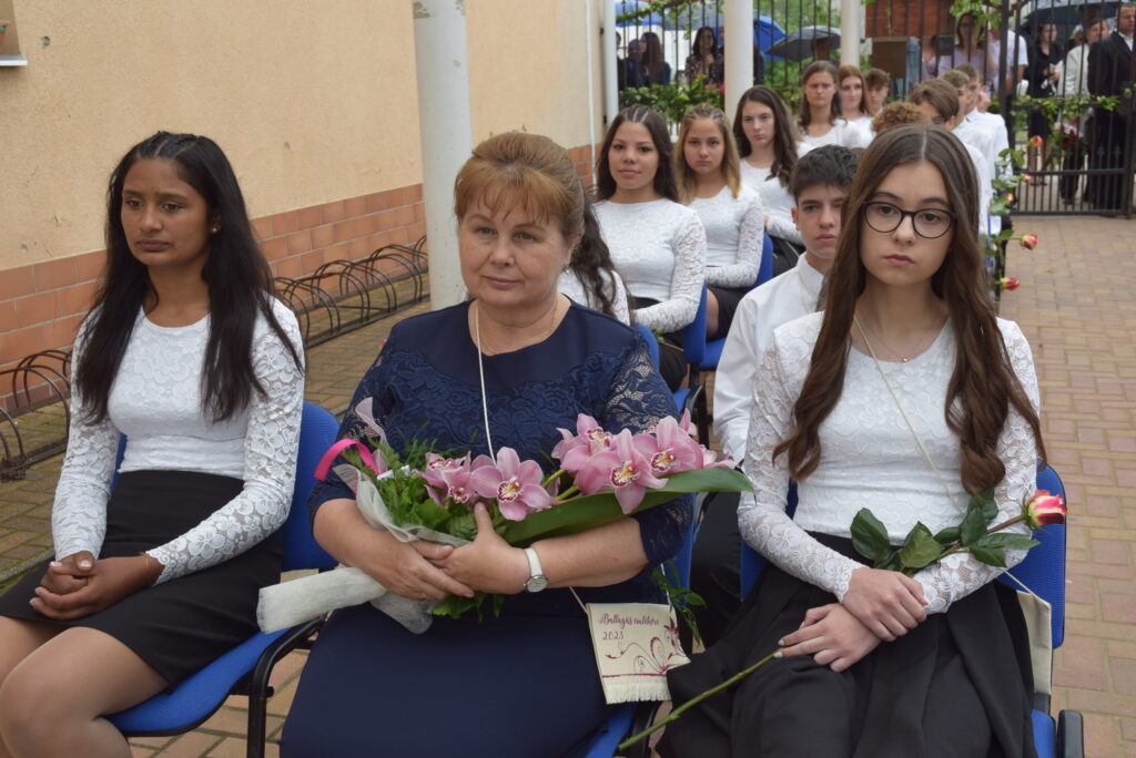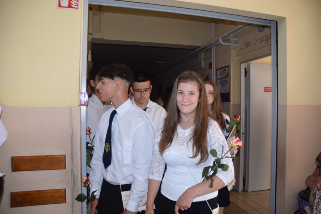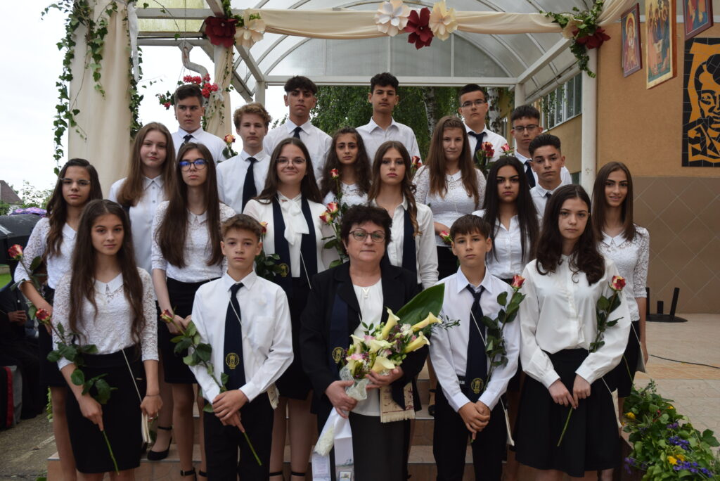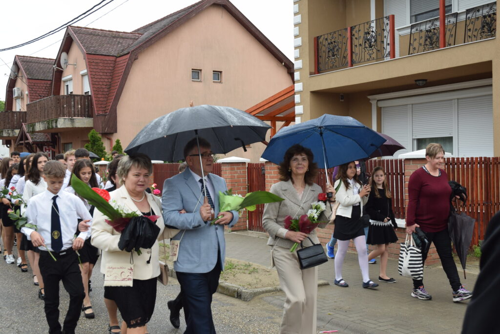Szombat délelőtt 39 nyolcadikos diákunk vett végső búcsút az általános iskolai évektől. A percről percre változó időjárás jelentést legalább annyira figyelték, várták az érintett diákok, pedagógusok és szülők, mint magát a ballagási ünnepséget. A csodaszépen feldíszített iskolára és a búcsúzó diákokra azonban a szülőkön, diákokon kívül a szemerkélő eső is kíváncsi volt, így idén esernyővel indultak utolsó általános iskolai útjukra a ballagók. Ünnepségünket megtisztelte Kocsis Fülöp metropolita atya is, aki a görögkatolikus templomban a gyerekekkel együtt imádkozott és adott hálát. A diáktársak sorfala között, esernyővel a kezükben, énekelve vonultak a ballagók az iskola udvarára, ahol már az esővédett árkádok alatt foglalhatták el helyüket, és hallgathatták végig a búcsúverseket, búcsúgondolatokat. A ballagók emlékszalagjait Lénárt Zsanett és Kerti Csenge kötötte fel az iskola zászlajára, majd a hetedikesek nevében Számadó Szonja és Szemán Amira, a nyolcadikosok nevében Szász Borbála és Tóth Zsuzsanna búcsúzott. Ezt követően Garda László intézményvezető szólt a ballagókhoz, majd köszönetet mondott a szülői munkaközösség tagjainak. Átvehették az okleveleket és a könyvjutalmakat azok a diákok is, akik kiérdemelték azt a tanulmányi és közösségi munkájuk, versenyeredményeik alapján. A rangos Szent Piroska-díjat ebben az évben négy tanuló vehette át. Büte Bíborka, Szász Borbála 8. a, valamint Kerti Csenge és Tóth Zsuzsanna 8. b osztályos tanulók. Az ünnepség végén Fülöp atya mondta el útravaló gondolatait a ballagóknak, akik a búcsúéneket követően az osztálytermekben Hajdufiná Imre Éva és Tóth Elekné osztályfőnökökkel együtt végleg elbúcsúztak az általános iskolai évektől. Minden végzős diákunknak sok sikert, kitartást és hitet kívánunk életük következő szakaszához. KGYZE