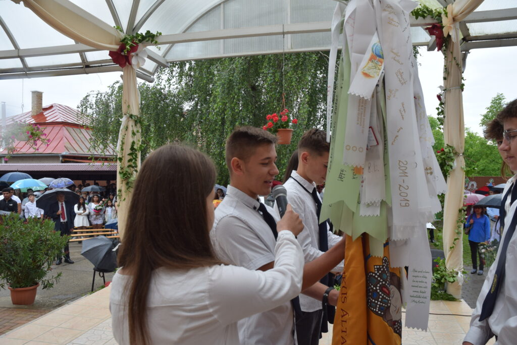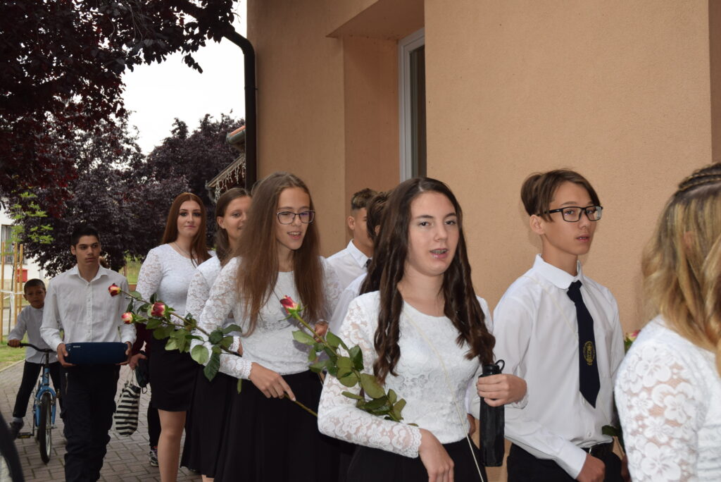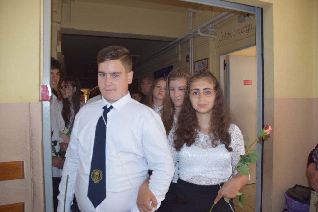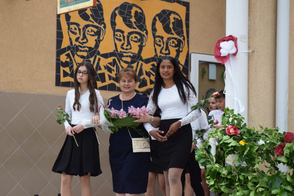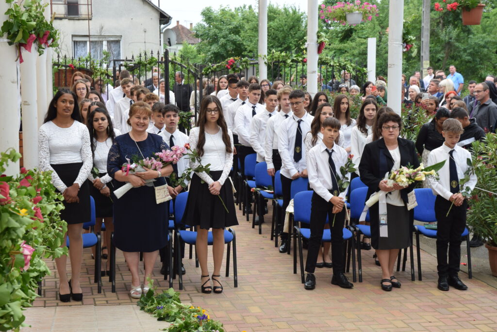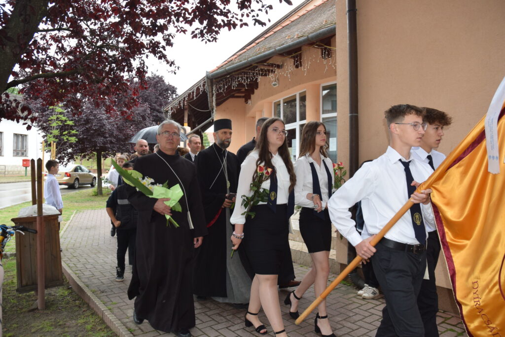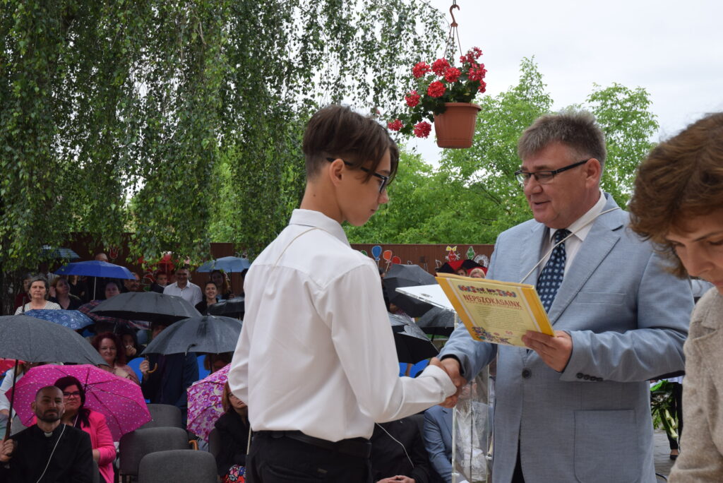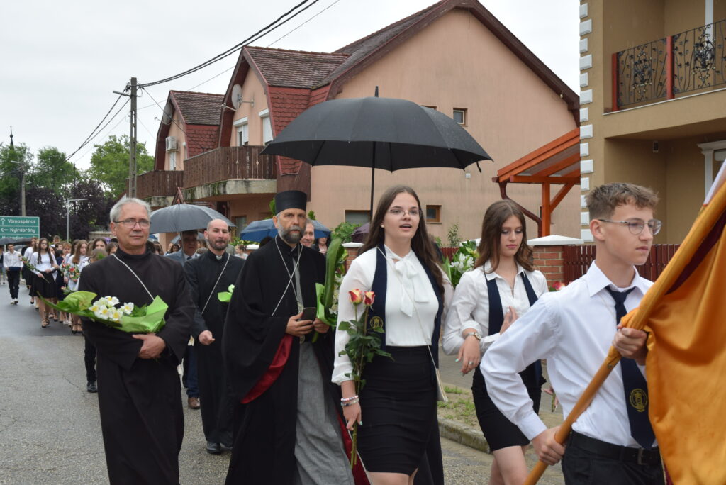 Szombat délelőtt 39 nyolcadikos diákunk vett végső búcsút az általános iskolai évektől. A percről percre változó időjárás jelentést legalább annyira figyelték, várták az érintett diákok, pedagógusok és szülők, mint magát a ballagási ünnepséget. A csodaszépen feldíszített iskolára és a búcsúzó diákokra azonban a szülőkön, diákokon kívül a szemerkélő eső is kíváncsi volt, így idén esernyővel indultak utolsó általános iskolai útjukra a ballagók. Ünnepségünket megtisztelte Kocsis Fülöp metropolita atya is, aki a görögkatolikus templomban a gyerekekkel együtt imádkozott és adott hálát. A diáktársak sorfala között, esernyővel a kezükben, énekelve vonultak a ballagók az iskola udvarára, ahol már az esővédett árkádok alatt foglalhatták el helyüket, és hallgathatták végig a búcsúverseket, búcsúgondolatokat. A ballagók emlékszalagjait Lénárt Zsanett és Kerti Csenge kötötte fel az iskola zászlajára, majd a hetedikesek nevében Számadó Szonja és Szemán Amira, a nyolcadikosok nevében Szász Borbála és Tóth Zsuzsanna búcsúzott. Ezt követően Garda László intézményvezető szólt a ballagókhoz, majd köszönetet mondott a szülői munkaközösség tagjainak. Átvehették az okleveleket és a könyvjutalmakat azok a diákok is, akik kiérdemelték azt a tanulmányi és közösségi munkájuk, versenyeredményeik alapján. A rangos Szent Piroska-díjat ebben az évben négy tanuló vehette át. Büte Bíborka, Szász Borbála 8. a, valamint Kerti Csenge és Tóth Zsuzsanna 8. b osztályos tanulók. Az ünnepség végén Fülöp atya mondta el útravaló gondolatait a ballagóknak, akik a búcsúéneket követően az osztálytermekben Hajdufiná Imre Éva és Tóth Elekné osztályfőnökökkel együtt végleg elbúcsúztak az általános iskolai évektől. Minden végzős diákunknak sok sikert, kitartást és hitet kívánunk életük következő szakaszához. KGYZE