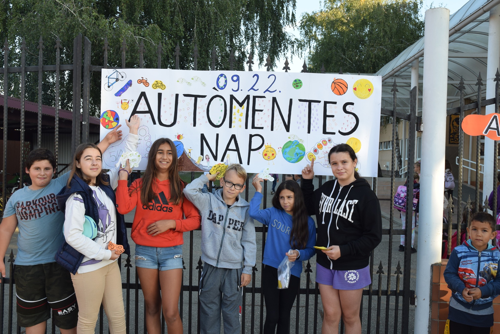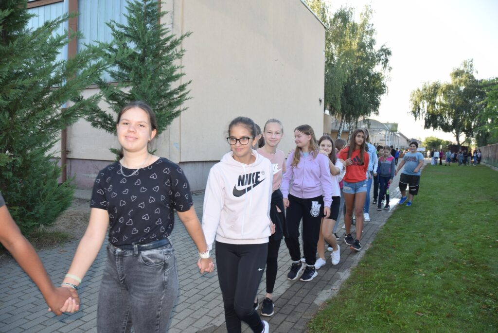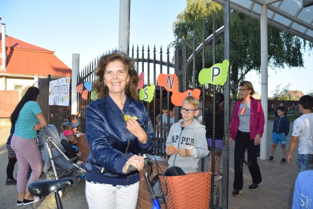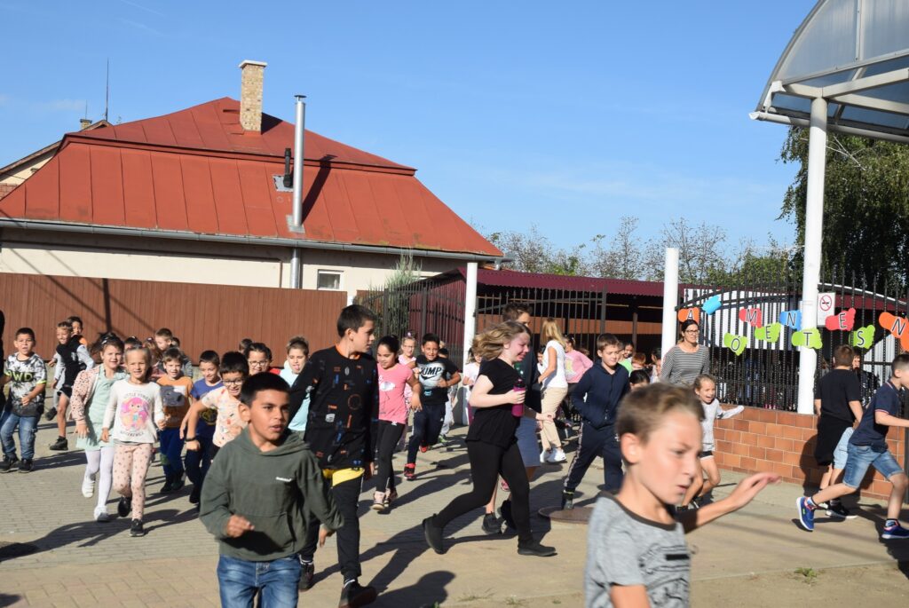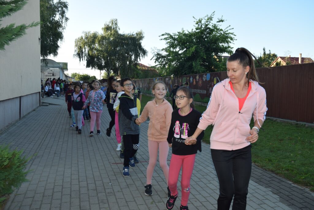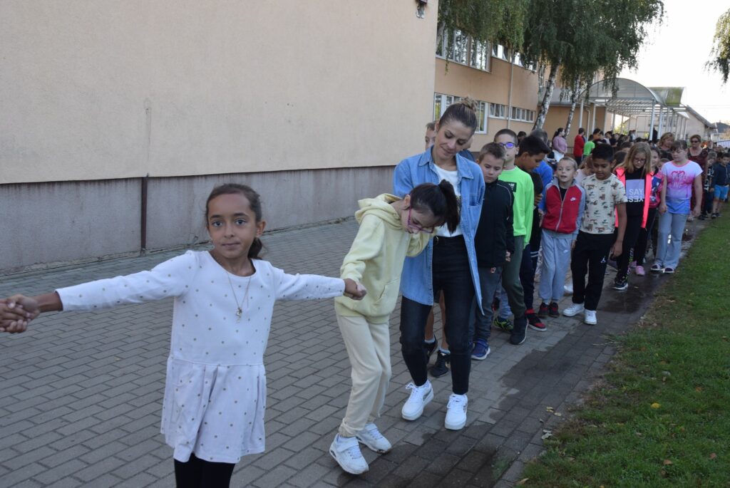 Szeptember 22-e, az autómentes nap, amit iskolánk idén összekapcsolt a magyar diáksport napjával. Már a reggeli érkezésnél Marozsán Tiborné Erzsike néni vezetésével kis tappancsokat, papír lábnyomokat kaptak azok a diákok, akik gyalog, és kerékpárkártyát azok, akik bringával jöttek ezen a napon iskolába. A máskor oly zsúfolt Szatmári utcán ma alig lehetett autót látni az iskola környékén, ami azt jelentette, hogy a szülők is komolyan vették a felhívást. Háromnegyed nyolctól Bogdán Krisztina tanárnő vezetésével reggeli bemelegítő zenés tornával kezdődött a nap, majd az egész iskola egy láncot alkotva menetelt a hátsó udvarra, ahol az alsósok előre elrejtett tappancsokat, kis papírlábnyomokat is kereshettek, amit finomságokra válthattak be a nap folyamán. Az első szünetben újra felsorakozott az iskola apraja, nagyja, és körbe futották az intézmény épületét. Ez is jó buli volt mindenkinek. Aztán következtek az alsós és felsős váltóversenyek, és az elmaradhatatlan zsinórlabda bajnokság is. Az épület emeletére vezető lépcsőt egész nap a Deákné Osvald Erika tanárnő és a diákok által keresett és nyomtatott sportolók képe díszítette, amik előtt sokan megálltak a nap folyamán. Ha csak egy nap erejéig is, de ma is sokat tettünk környezetünk, és saját magunk egészségéért. Bízunk benne, hogy egyre többen tanulják meg, hogy környezettudatosan élni azt jeleneti, hogy saját jövőnkre vigyázunk. KGYZE