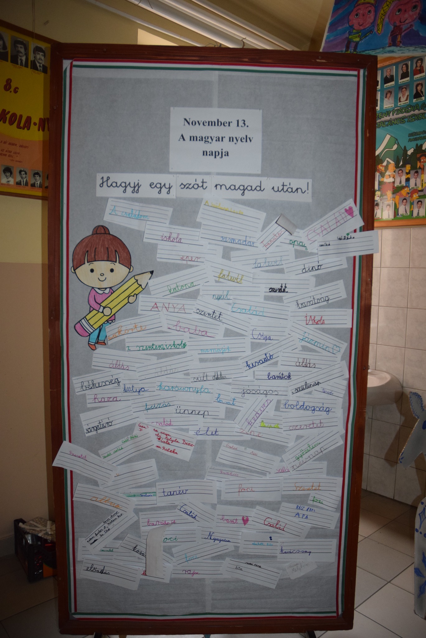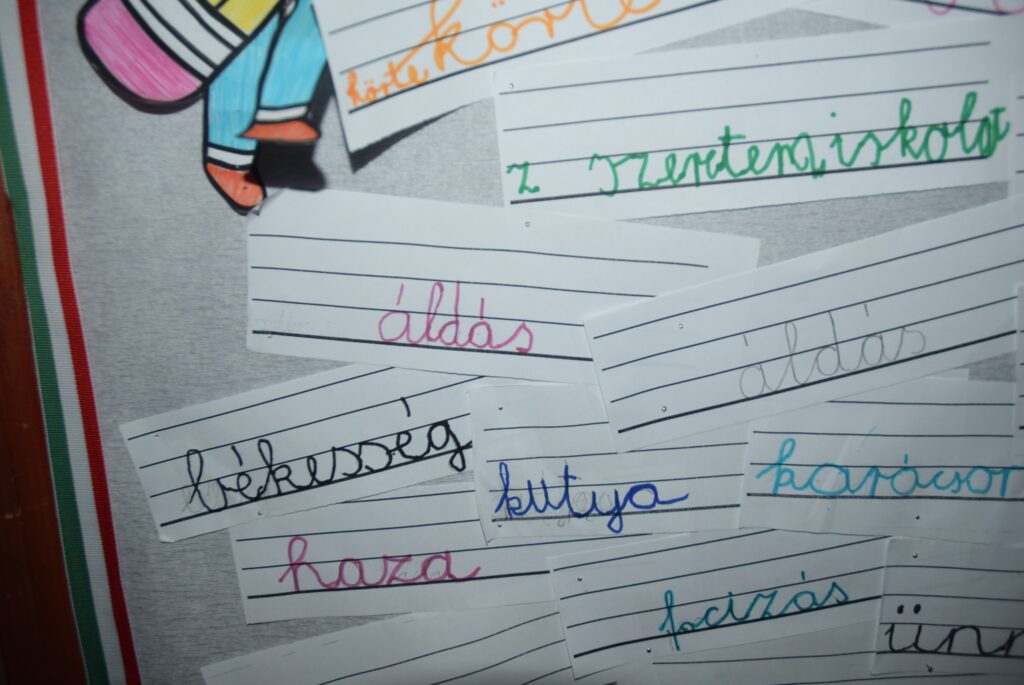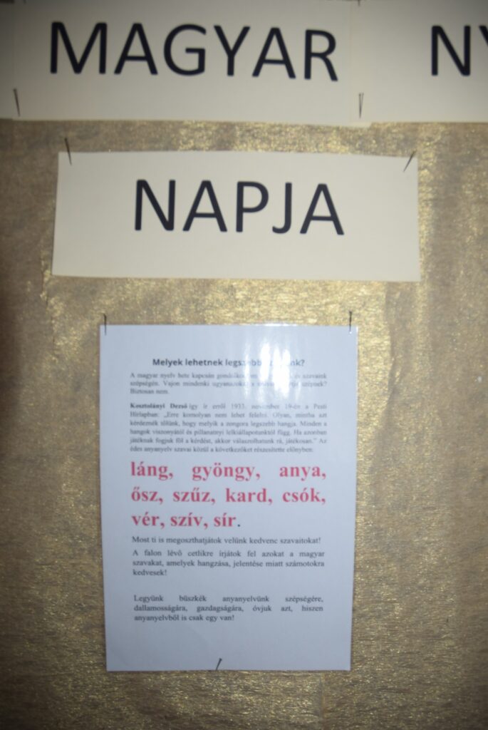Matilné Bollók Nikolett tanárnő szervezésében a második, harmadik, negyedik osztályos diákok november 13-a, a magyar nyelv napja óta gyűjtögetik a szebbnél szebb magyar szavakat a „Hagyj egy szót magad után!” fantázianevű projekt keretében. A tanulók azt a feladatot kapták a tanárnőtől, hogy írják fel egy papírlapra az általuk legjobban szívmelengető, kedves szót. A gyerekek többek között a következő szavakat hagyták maguk után: szeretet, béke, anya, áldás, karácsony, békesség, haza, ünnep, barát, élet… és még számtalan szép magyar szó. Simonné Czentye Anikó vezetésével a felső tagozatosok szavak helyett egy-egy szép gondolatot írtak az első emeleti üzenőfalra. KGYZE