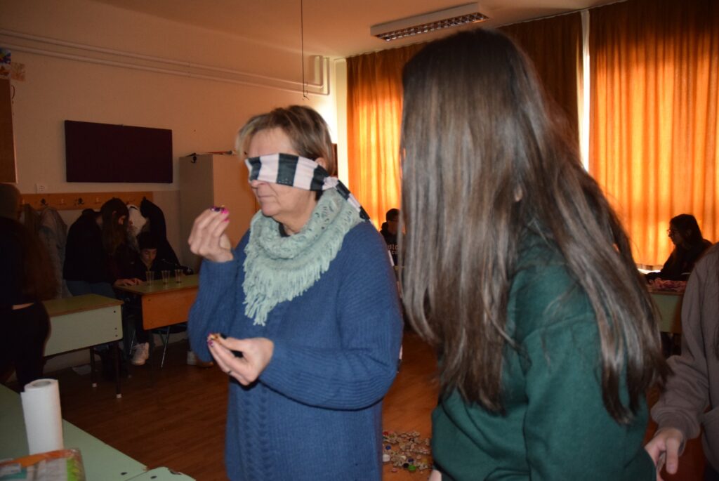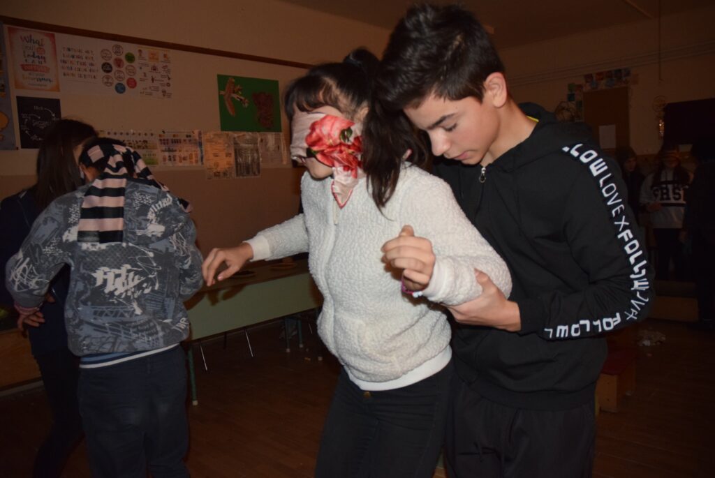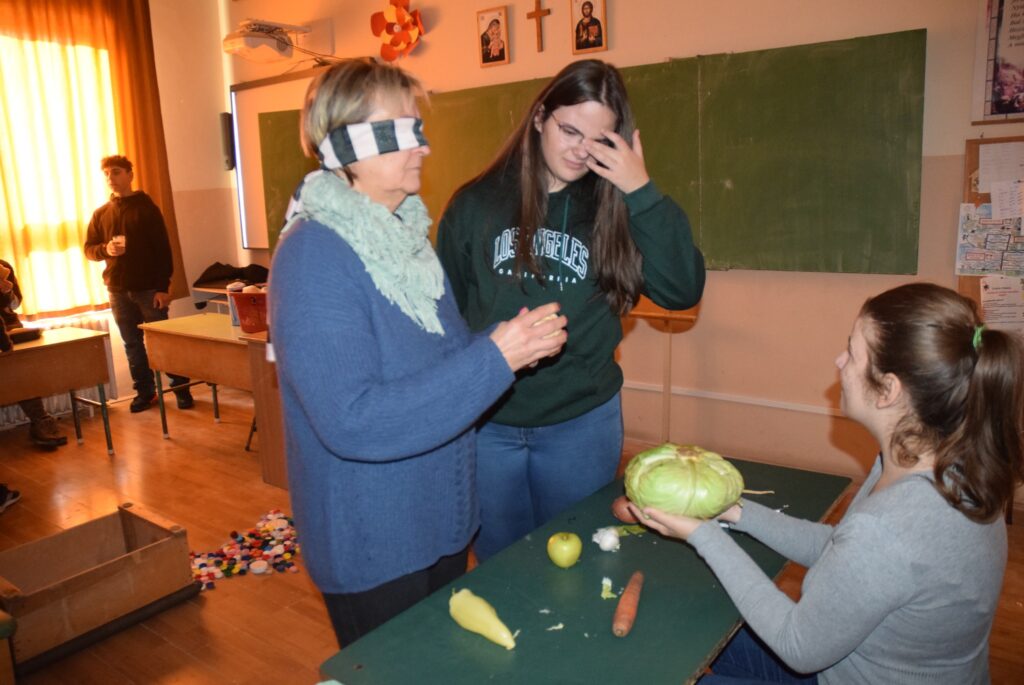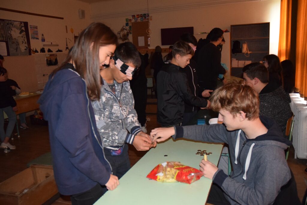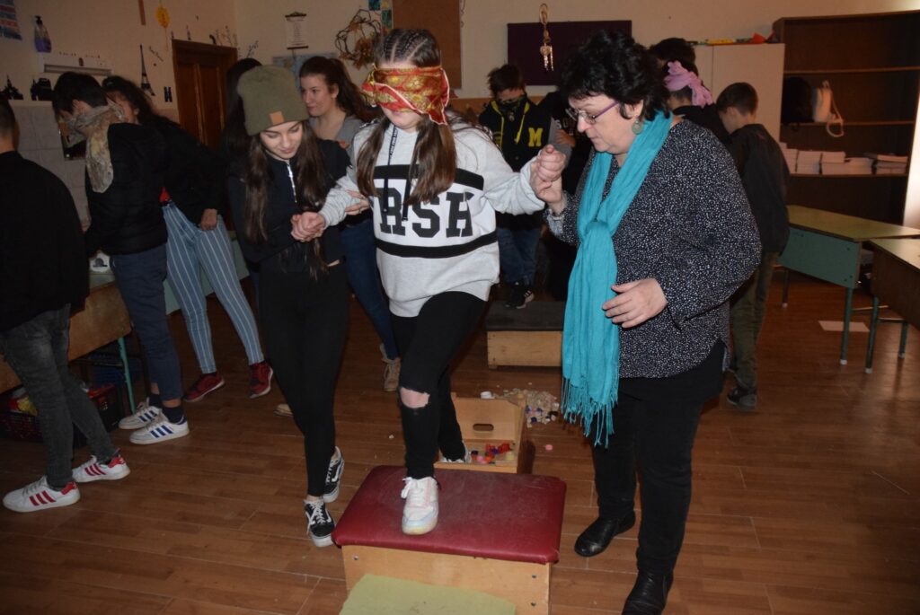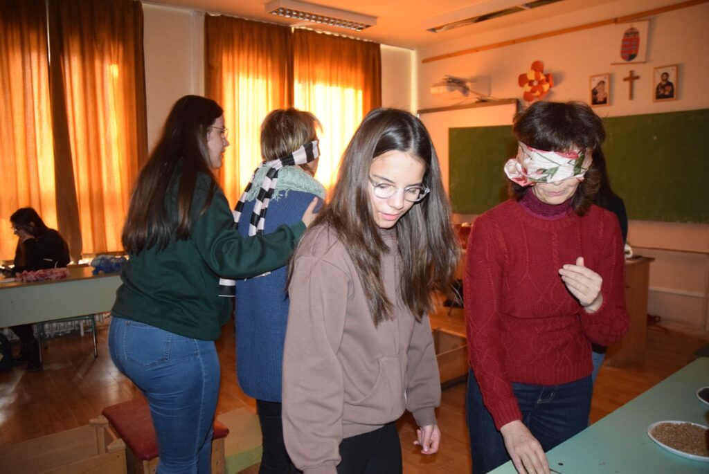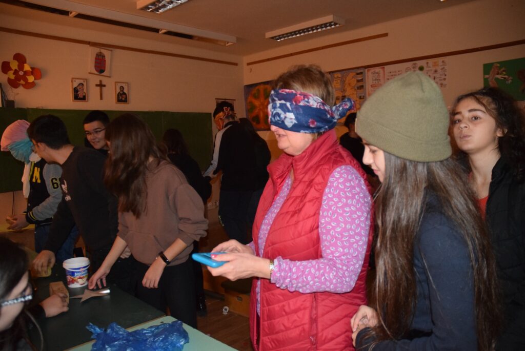 Hajdufiné Imre Éva tanárnő szervezésében és vezetésével december – jén délelőtt ismét „betekinthettek” iskolánk tanulói és a vállalkozó tanárok a vakok és gyengénlátók életébe. A kendővel eltakart szemű felső tagozatosokat a 8. a osztály tanulói navigálták, vezetgették nagy odafigyeléssel és példa értékű gondoskodással, fegyelemmel. Nem először tartunk hasonló érzékenyítő napot iskolánkban, de még mindig megdöbbentő a gyerekek számára, mennyire nehéz látás nélkül akár egy pohár vizet tölteni, vagy szaglás útján felismerni egy fűszert, tapintással egy-egy zöldséget, gyümölcsöt. Hogy mennyire nem egyszerű még a járás sem a vakok és gyengénlátók számára, azt ismét előre kiépített pályán próbálhatták ki a gyerekek. Minden évben egyre jobban bízunk abban, hogy már gyermekként is, de felnőttként mindenképpen segítő érzékenységgel fordulnak majd a segítségre szoruló társaik felé. KGYZE