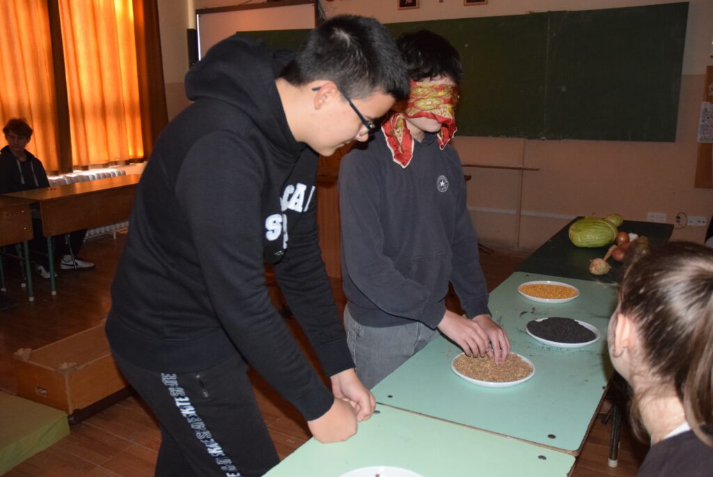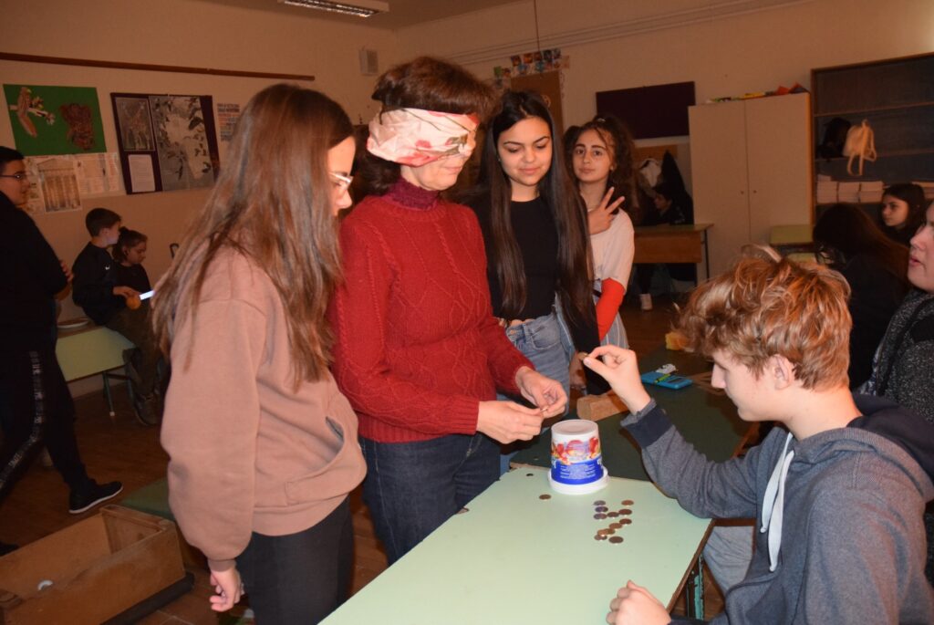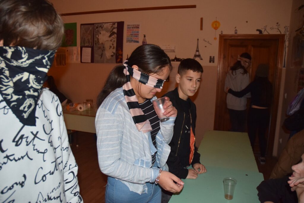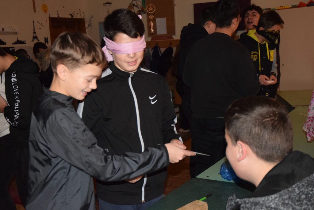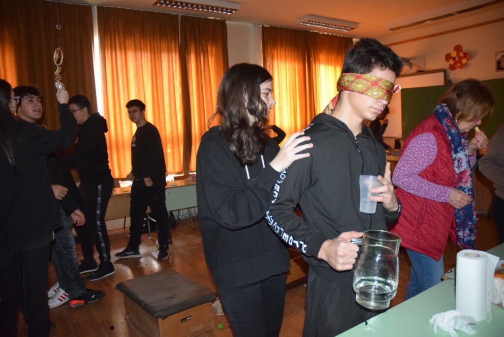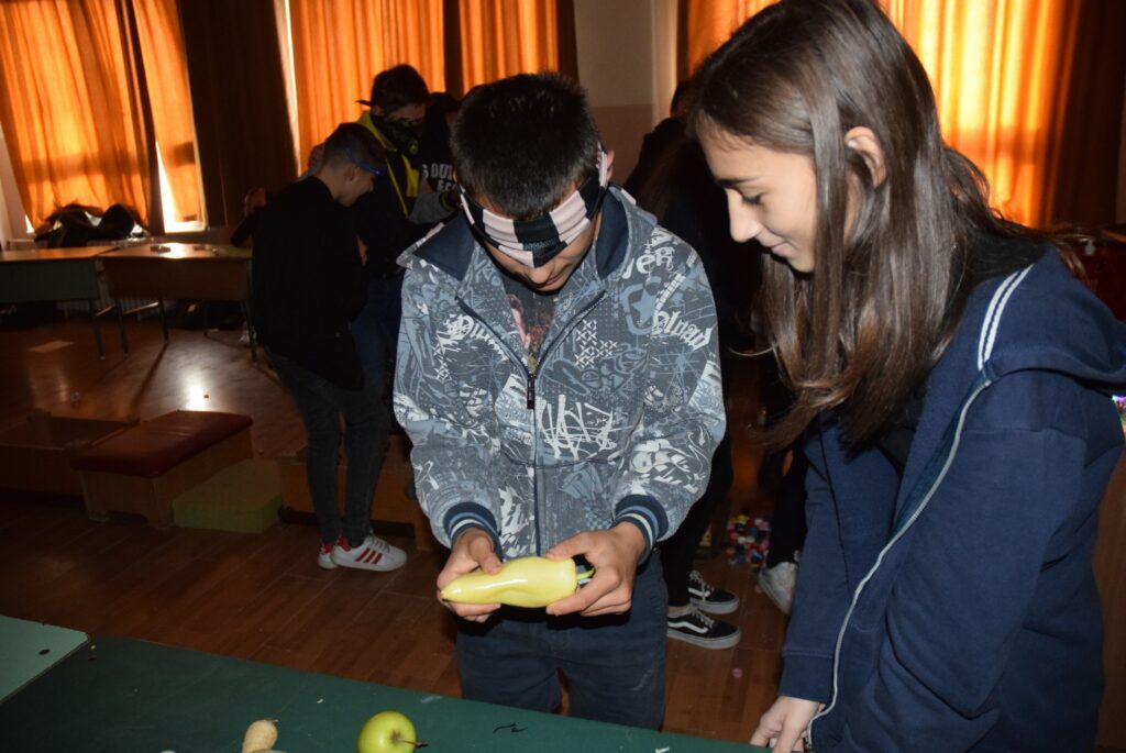 Hajdufiné Imre Éva tanárnő szervezésében és vezetésével december – jén délelőtt ismét „betekinthettek” iskolánk tanulói és a vállalkozó tanárok a vakok és gyengénlátók életébe. A kendővel eltakart szemű felső tagozatosokat a 8. a osztály tanulói navigálták, vezetgették nagy odafigyeléssel és példa értékű gondoskodással, fegyelemmel. Nem először tartunk hasonló érzékenyítő napot iskolánkban, de még mindig megdöbbentő a gyerekek számára, mennyire nehéz látás nélkül akár egy pohár vizet tölteni, vagy szaglás útján felismerni egy fűszert, tapintással egy-egy zöldséget, gyümölcsöt. Hogy mennyire nem egyszerű még a járás sem a vakok és gyengénlátók számára, azt ismét előre kiépített pályán próbálhatták ki a gyerekek. Minden évben egyre jobban bízunk abban, hogy már gyermekként is, de felnőttként mindenképpen segítő érzékenységgel fordulnak majd a segítségre szoruló társaik felé. KGYZE