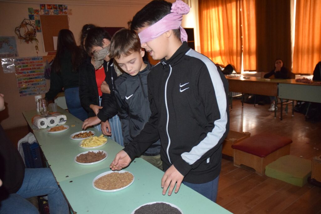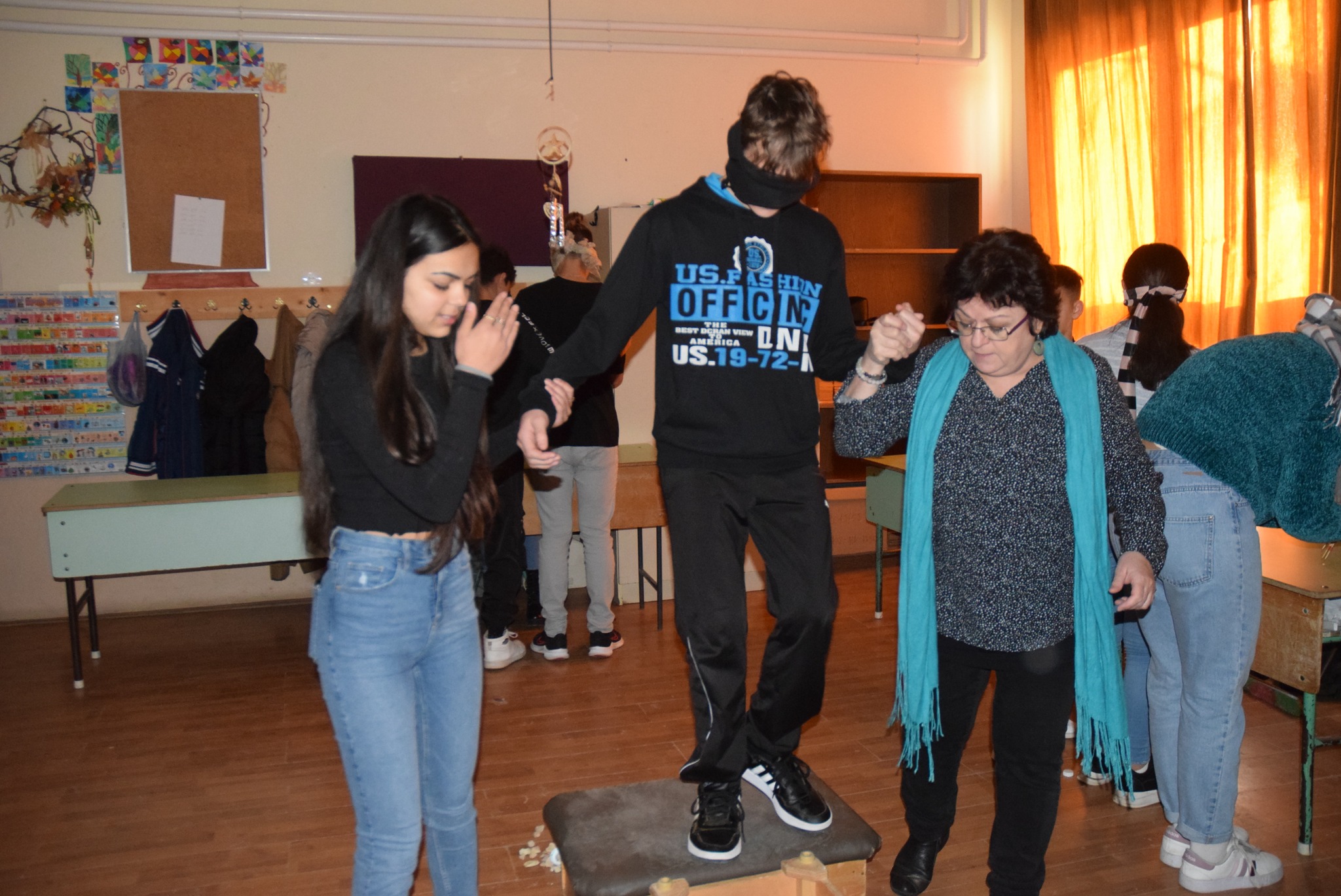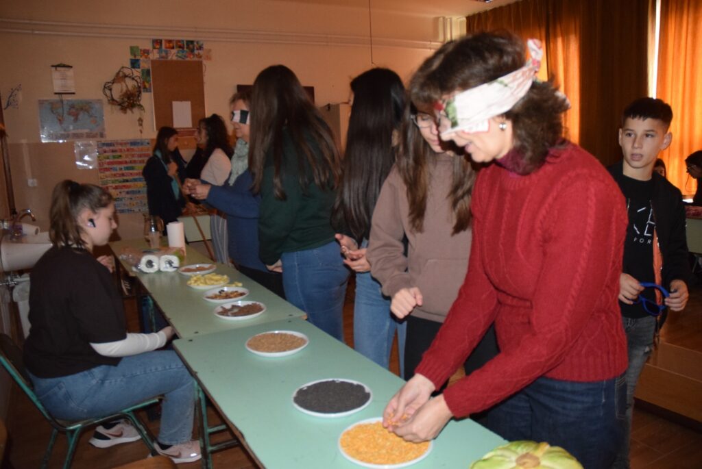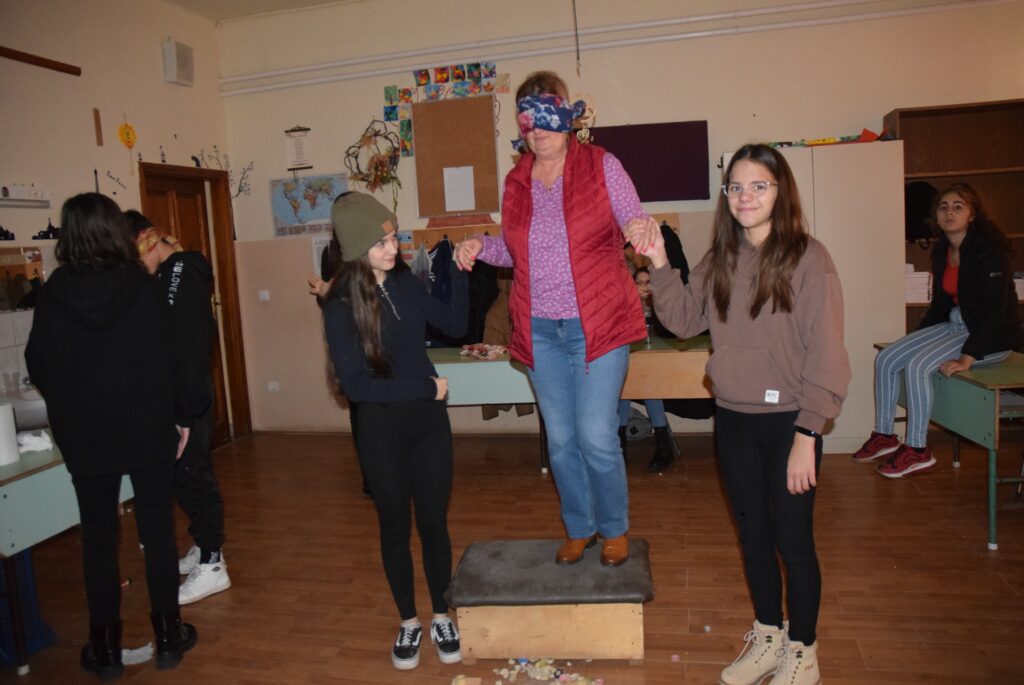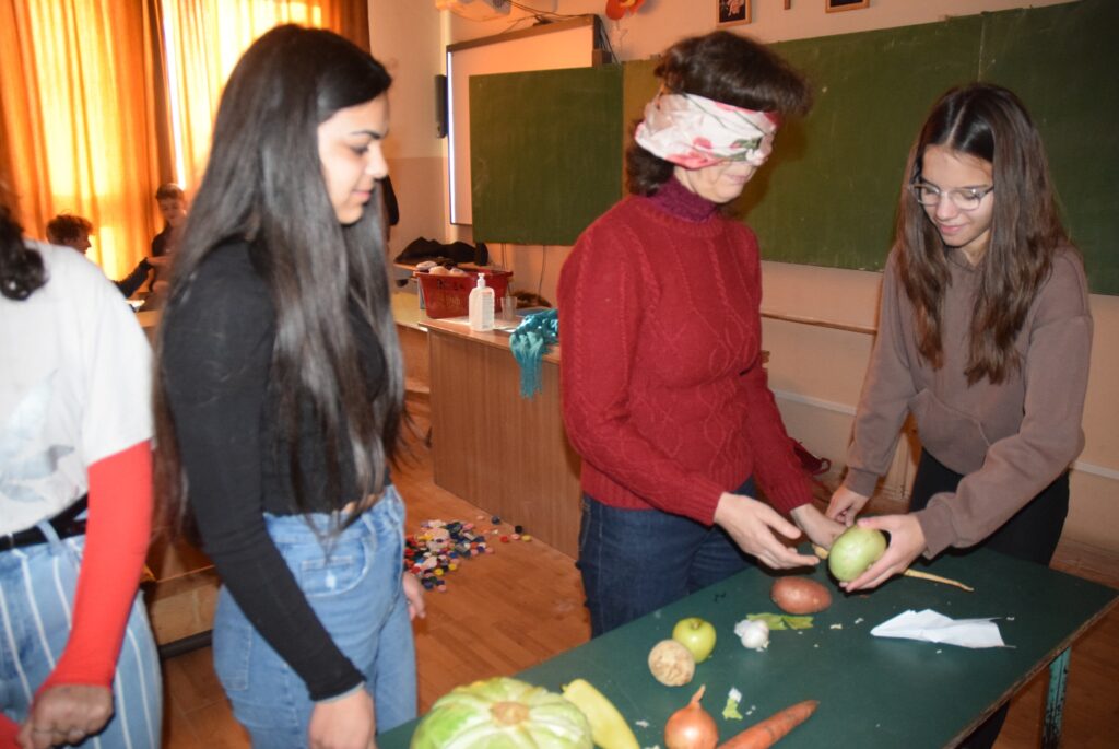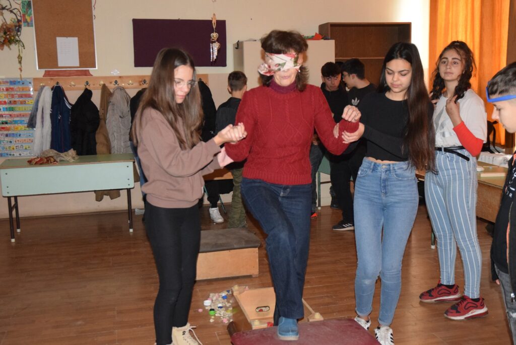 Hajdufiné Imre Éva tanárnő szervezésében és vezetésével december – jén délelőtt ismét „betekinthettek” iskolánk tanulói és a vállalkozó tanárok a vakok és gyengénlátók életébe. A kendővel eltakart szemű felső tagozatosokat a 8. a osztály tanulói navigálták, vezetgették nagy odafigyeléssel és példa értékű gondoskodással, fegyelemmel. Nem először tartunk hasonló érzékenyítő napot iskolánkban, de még mindig megdöbbentő a gyerekek számára, mennyire nehéz látás nélkül akár egy pohár vizet tölteni, vagy szaglás útján felismerni egy fűszert, tapintással egy-egy zöldséget, gyümölcsöt. Hogy mennyire nem egyszerű még a járás sem a vakok és gyengénlátók számára, azt ismét előre kiépített pályán próbálhatták ki a gyerekek. Minden évben egyre jobban bízunk abban, hogy már gyermekként is, de felnőttként mindenképpen segítő érzékenységgel fordulnak majd a segítségre szoruló társaik felé. KGYZE