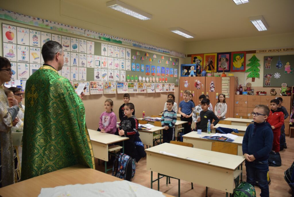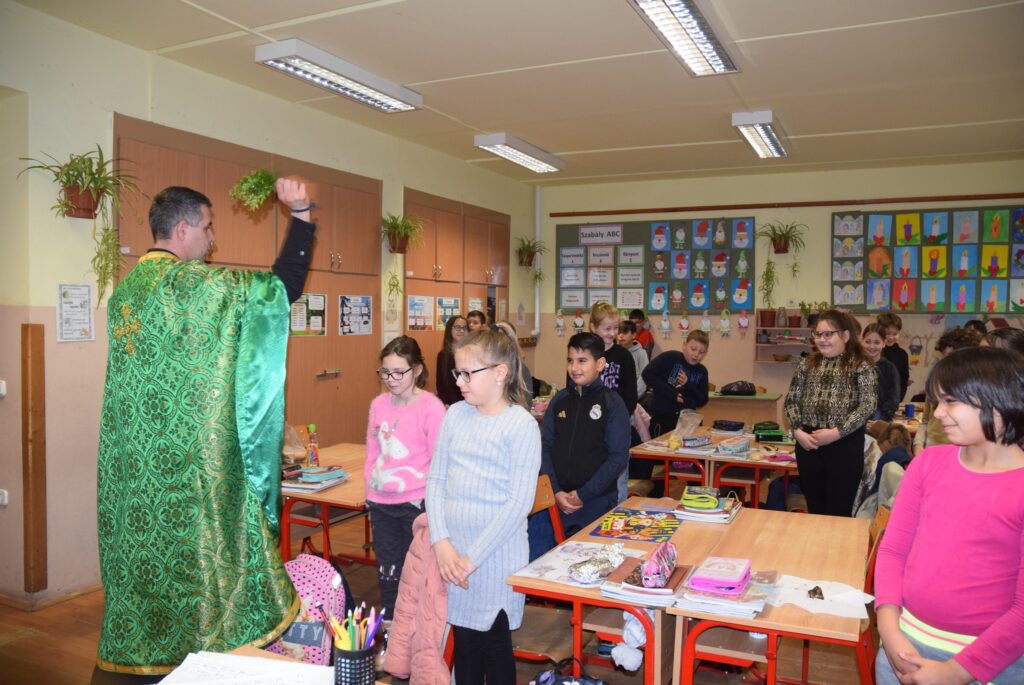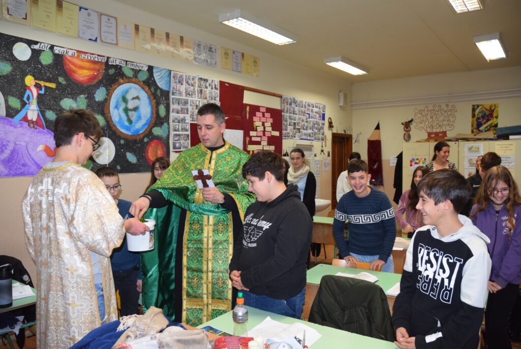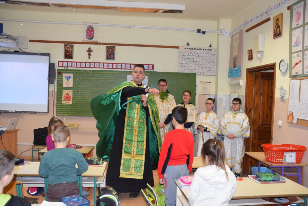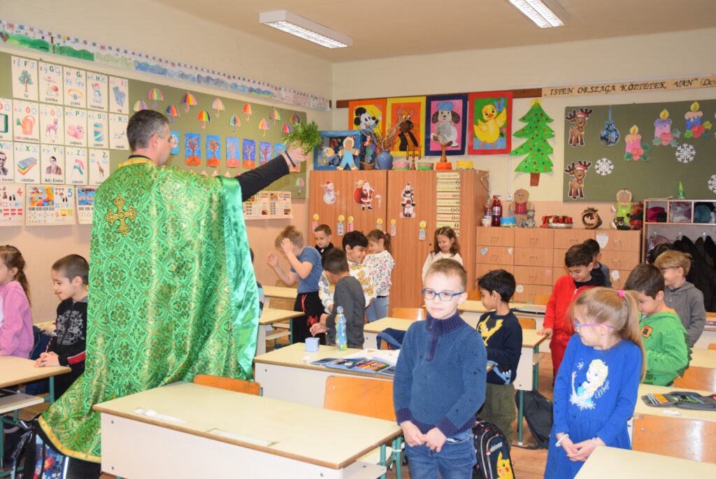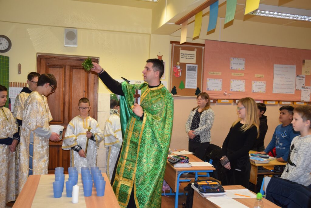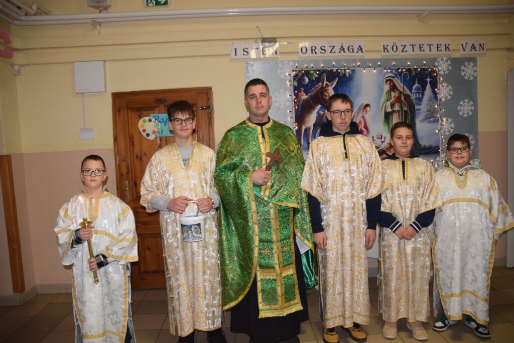 Január 6-án reggel liturgiával kezdtük az új esztendőt a templomban. Zoltán atya örömét fejezte ki, hogy ismét gyermekekkel telt meg az Isten háza. Ezt követően a vízkereszt ünnepéről beszélt. Jézusról, aki János által megkeresztelkedett a Jordán folyó vizében. Felhívta a gyerekek figyelmét arra is, hogy azért is fontos ez az ünnep, mert ekkor kinyilatkoztatja magát a szentháromság. Jézus belép a Jordán vizébe, látjuk, ahogy a szentlélek megjelenik galamb képében, és halljuk az Úristen szavát: Ez az én fiam! A liturgia végén vízszentelésre is sor került, majd visszatérve az iskolába Zoltán atya a ministránsok kíséretében megszentelte az épület valamennyi tantermét és egyéb helyiségét is, kérve Isten áldását az ott tanuló gyermekekre, és az ott dolgozó felnőttekre is. KGYZE