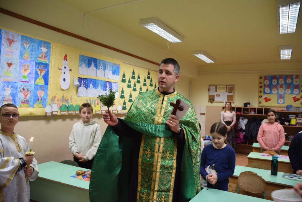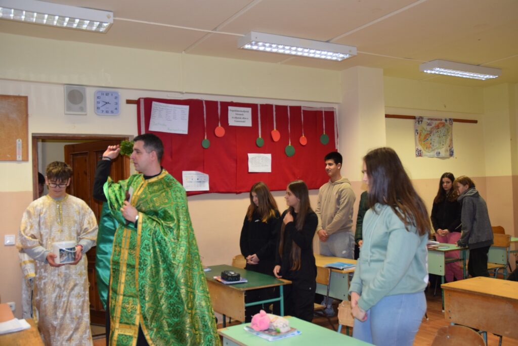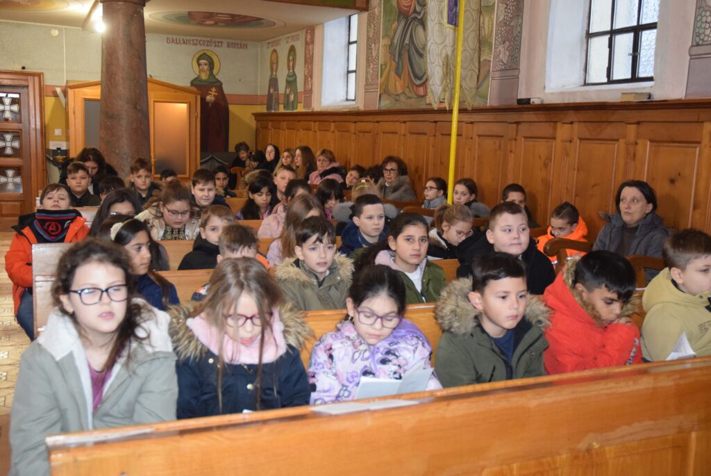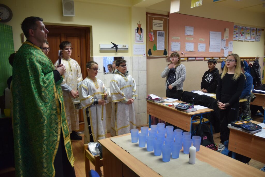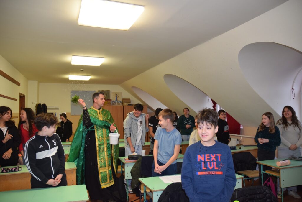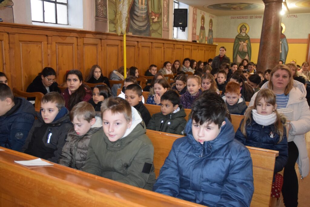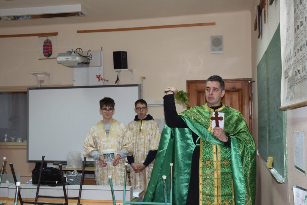 Január 6-án reggel liturgiával kezdtük az új esztendőt a templomban. Zoltán atya örömét fejezte ki, hogy ismét gyermekekkel telt meg az Isten háza. Ezt követően a vízkereszt ünnepéről beszélt. Jézusról, aki János által megkeresztelkedett a Jordán folyó vizében. Felhívta a gyerekek figyelmét arra is, hogy azért is fontos ez az ünnep, mert ekkor kinyilatkoztatja magát a szentháromság. Jézus belép a Jordán vizébe, látjuk, ahogy a szentlélek megjelenik galamb képében, és halljuk az Úristen szavát: Ez az én fiam! A liturgia végén vízszentelésre is sor került, majd visszatérve az iskolába Zoltán atya a ministránsok kíséretében megszentelte az épület valamennyi tantermét és egyéb helyiségét is, kérve Isten áldását az ott tanuló gyermekekre, és az ott dolgozó felnőttekre is. KGYZE