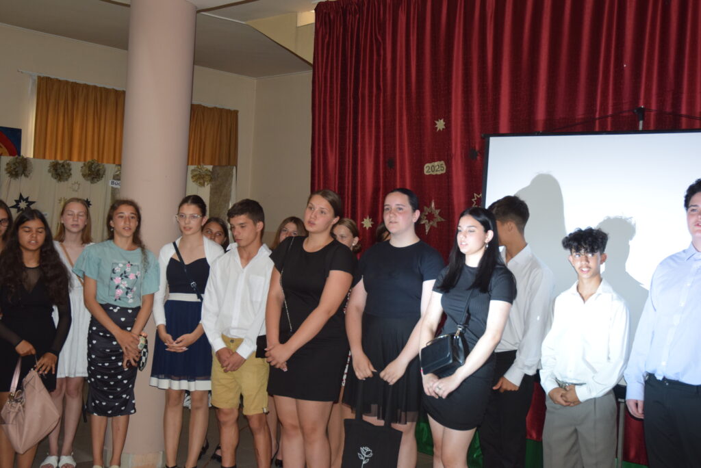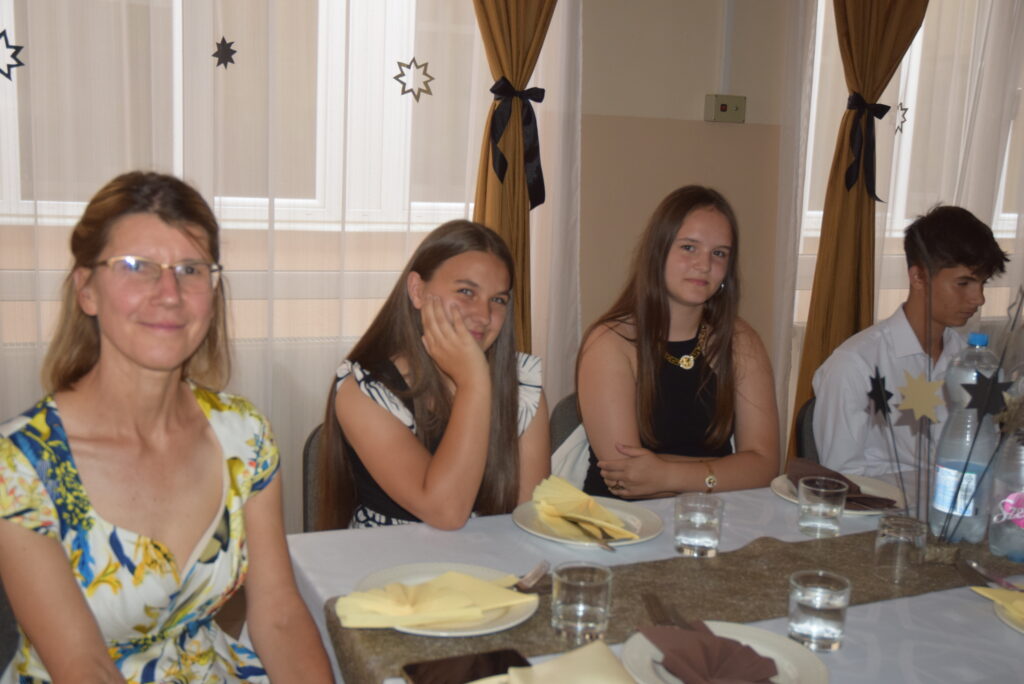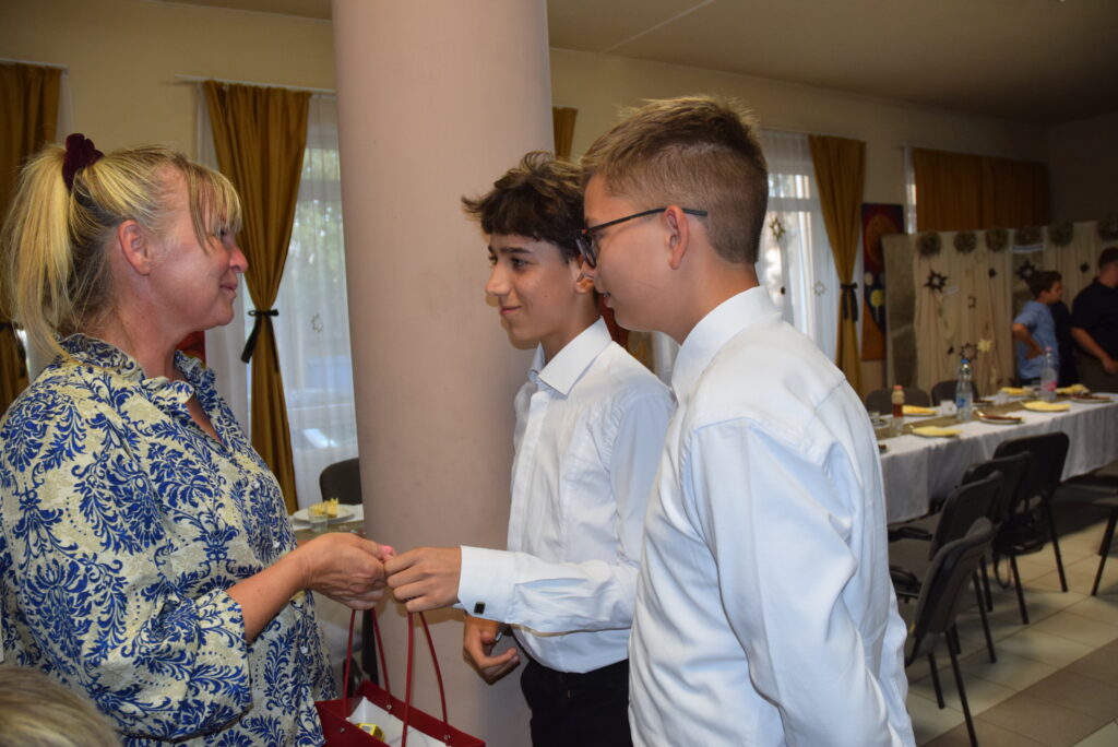 A liturgiát követően az iskola aulájában szépen feldíszített falak, terített asztal várta a végzősöket. Itt már egy kicsit kötetlenebb formában, bohókásabb hangulatban és tartalommal búcsúztak. A 8. b osztály zenével, fotókkal, dalokkal, idézte az elmúlt nyolc év emlékeit, a 8. a osztály pedig egy saját maguk által készített kisfilmmel emlékezett az iskolában, a tanórákon töltött vidám percekre. A vacsora előtt Garda László igazgató úr osztotta meg útravaló gondolatait a ballaó diákokkal. Elmondta, hogy az emlékeket idézve érzékelhető volt, hogy mindkét osztály jó közösséggé formálódott a nyolc év alatt. Megfogalmazta maga, és a pedagógusok nevében, hogy mindenki reménykedik abban, hogy a Szent Piroskában elvetett mag jó földbe hullott, és sok-sok termést hoz majd a jövőben a végzősök számára. Minden búcsúzó diákunknak kívánjuk, hogy váljanak valóra álmaik, s ha szükségük lesz támogató, bátorító szóra, a Szent Piroskába mindig bizalommal térhetnek vissza.