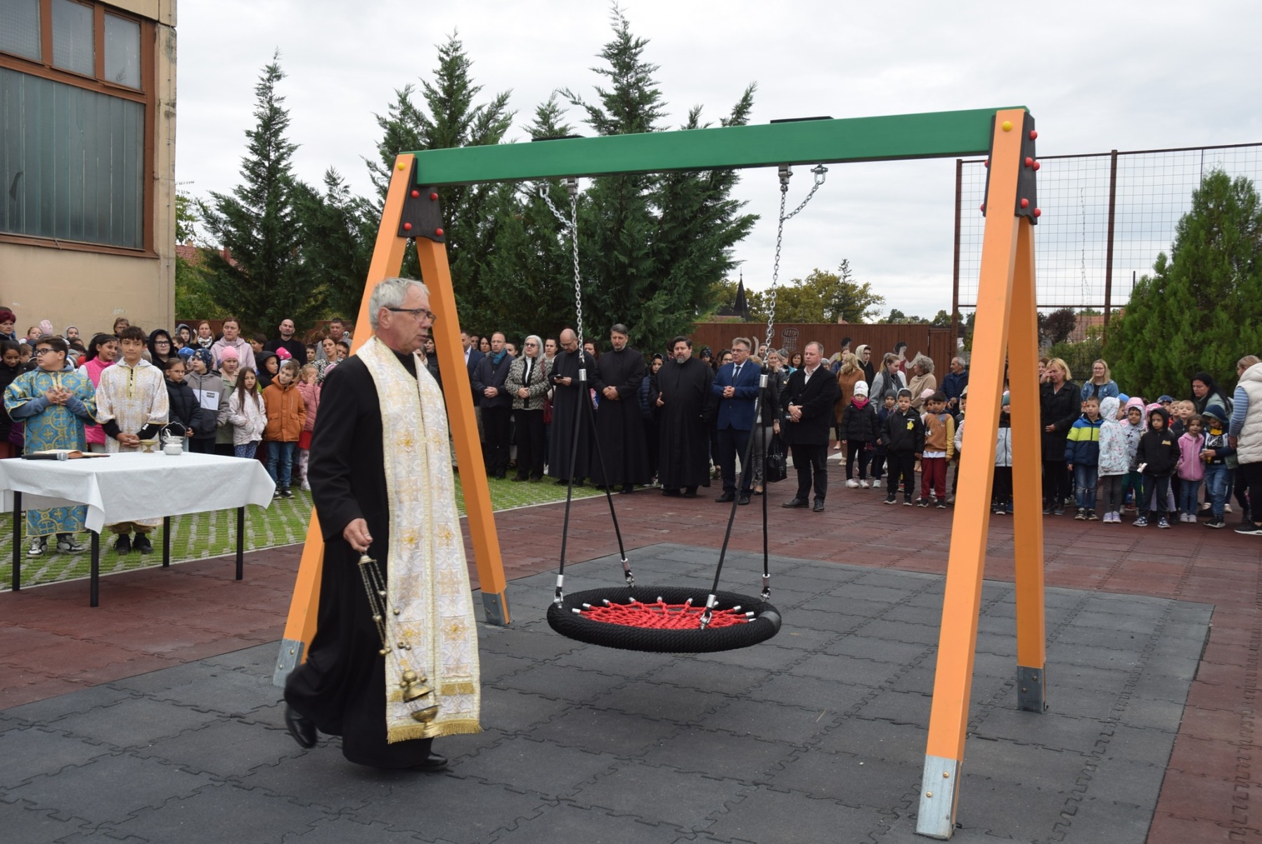 Ezt követően mindenki átvonult a csodálatos őszi színekben pompázó dekorációval díszített iskolaudvarra, ahol a gyerekek, a pedagógusok, a meghívott vendégek előszön egy vidám táncot nézhettek meg, melyet Erdei-Kis Brigitta, a szülői munkaközösség tagja tanított be, majd Garda László igazgató szólt az egybegyűltekhez. Először is felhívta a figyelmet arra, hogy szeptemberben immár a 15. tanévet kezdtük meg egyházi fenntartású intézményként. – 15 éve formáljuk ezt a közösséget, ahol nemcsak tanítunk, de hitet is építünk gyermekeink között. Jézus azt mondta, hogy ahol a szívünk van, ott van a kincsünk. A mi kincseink ti vagytok nekünk gyerekek, hisz ti laktok a szívünk közepén. Ma pedig átadjuk nektek azt a játszóteret, amit nektek, értetek építettünk – hangzottak Garda László szavai. Igazgató út köszönetet mondott mindazoknak, akik részt vettek a beruházás létrejöttében. Az egyházmegye részéről Kocsis Fülöp érsek-metropolita atyának, Seszták István főhelynök atyának, Czövek Éva oktatási referens asszonynak, a kivitelező Köles és Fiai Kft-nek, a játékokért pedig a Szent Piroska Gyermekmosoly Alapítványnak, a Roma Önkormányzatnak, a Szülői Munkaközösségnek. Eztán Bródi-Bálega Anna és Őri Tiborné betanításában Suga Borbála és Gulyás Zsombor előadásában Tóth Ágnes: Játszótéren című versét hallgathatta meg a közönség, majd Seszták atya szólt a megjelentekhez, aki arról beszélt, hogy emlékeztessen ez a játszótér mindenkit arra, hogy Isten játékra hív valamennyiünket. Nemcsak gyermekként, de felnőttkén is, egész életünkön át. Ha játszótér, akkor nem maradhat el a játék sem. Az avató ünnepség bevezető részének utolsó mozzanataként László Gyula labdazsonglőr varázsolta el a közönséged, de legfőképpen a kicsiket. A műsort és a beszédeket követően a hátsó udvaron Tóth Elek parókus atya megáldotta a játszóteret, majd Garda László igazgató úr hivatalosan is engedélyt adott arra, hogy mindenki birtokba vegye a játszóteret, aminek minden diák annyira örült, hogy a birtokba vétel bizony örömteli futásba ment át, hogy mihamarabb kipróbálhassák azt. Voltak, akik beültek a kis faházakba, többen hintáztak, libikókáztak, de sokan állta sorba a csúszdánál is. A kisebbek talán a homokozónak örültek a legjobban, a lapátoknak, dömpereknek, talicskáknak, a lengőtekének, és megannyi hasznos játéknak. Most már csak az lesz a fontos, hogy a lehető legtovább megőrizzük ezeket a régen várt kincseket. Míg a gyerekeke a játékokat élvezték, addig a meghívottak szeretetvendégségen vehettek részt az iskola aulájában. KGYZE